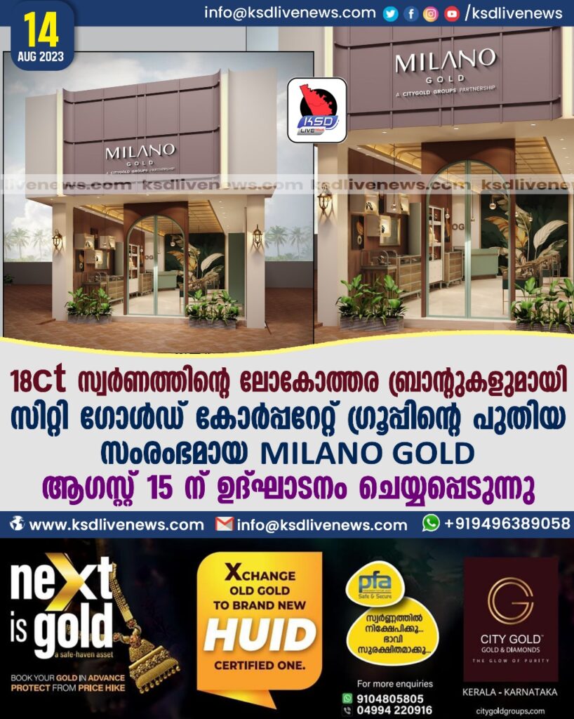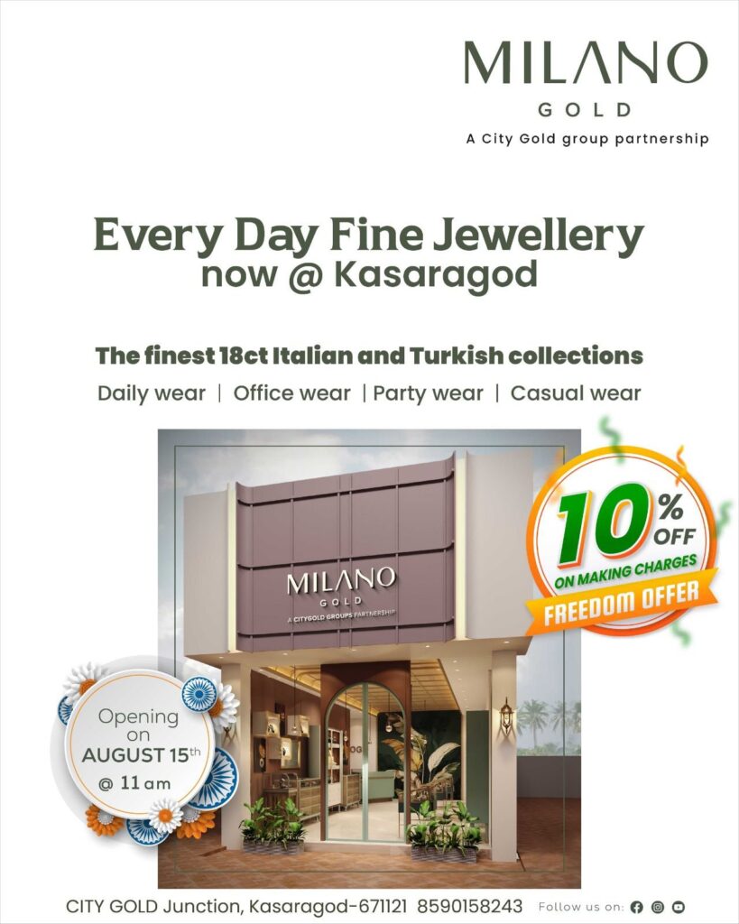കാസറഗോഡ്: 18ct സ്വർണത്തിന്റെ ലോകോത്തര ബ്രാന്റുകളുമായി സിറ്റി ഗോൾഡ് കോർപ്പറേറ്റ് ഗ്രൂപ്പിന്റെ പുതിയ സംരംഭമായ MILANO GOLD ആഗസ്റ്റ് 15 ന് ഉദ്ഘാടനം ചെയ്യപ്പെടുന്നു