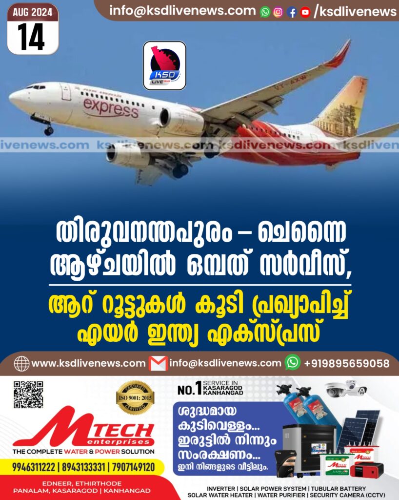 തിരുവനന്തപുരം-ചെന്നൈ ആഴ്ചയില് ഒമ്ബത് സര്വീസ്, ആറ് റൂട്ടുകള് കൂടി പ്രഖ്യാപിച്ച് എയര് ഇന്ത്യ എക്സ്പ്രസ്