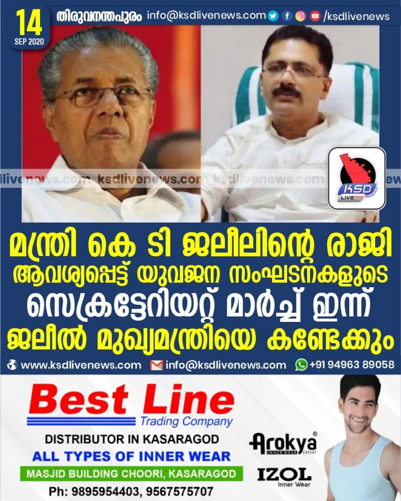 തിരുവനന്തപുരം: മന്ത്രി കെ ടി ജലീല്‍ ഇന്ന് മുഖ്യമന്ത്രിയെ കണ്ടേക്കും. സ്വര്‍ണക്കടത്ത് കേസില്‍ എന്‍ഫോഴ്സ്മെന്റ് ഡയറക്ടറേറ്റിന്റെ ചോദ്യം ചെയ്യലിന് ശേഷം കഴിഞ്ഞ ദിവസം രാത്രിയാണ് അദ്ദേഹം തലസ്ഥാനത്തെത്തിയത്. മന്ത്രിയുടെ രാജി ആവശ്യപ്പെട്ട് യുവജനസംഘടനകള്‍ ഇന്ന് സെക്രട്ടേറിയറ്റ് മാര്‍ച്ച്‌ പ്രഖ്യാപിച്ചിട്ടുണ്ട്.