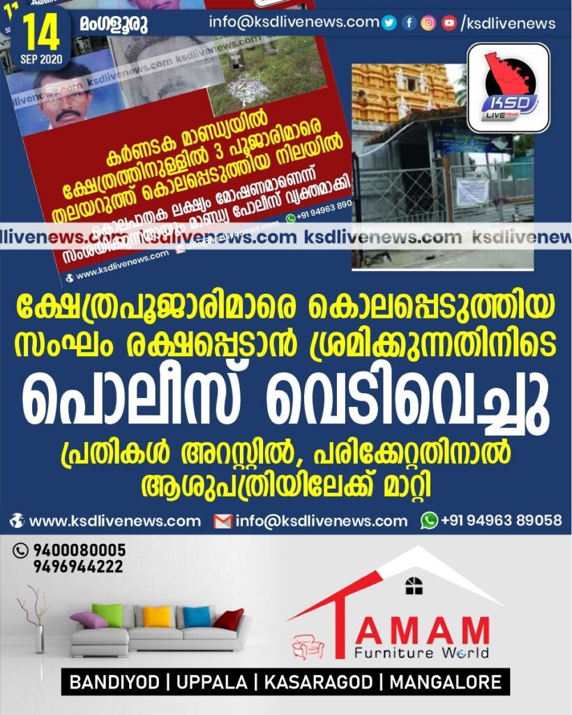 ക്ഷേത്രപൂജാരിമാരെ കൊലപ്പെടുത്തിയ സംഘം രക്ഷപ്പെടാന് ശ്രമിക്കുന്നതിനിടെ പൊലീസ് വെടിവെച്ചു ; പ്രതികള് അറസ്റ്റില്,