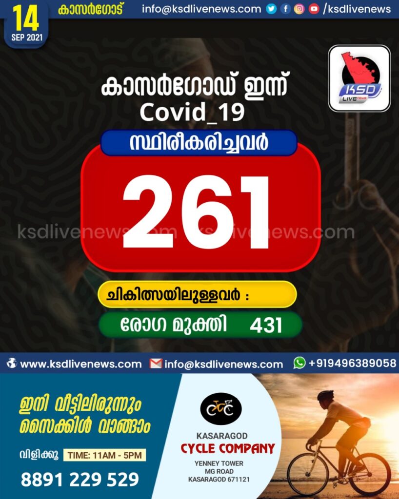 കാസർഗോഡ് ജില്ലയിൽ ഇന്ന് 261 പേർക്ക് കോവിഡ് സ്ഥിരീകരിച്ചു. 431 പേർക്ക് രോഗമുക്തി