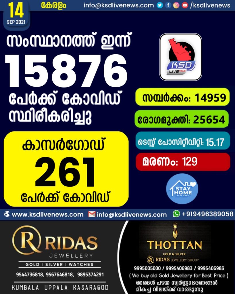 സംസ്ഥാനത്ത് ഇന്ന് 15,876 പേർക്ക് കോവിഡ് സ്ഥിരീകരിച്ചു. സമ്പർക്കം വഴി 14,959 പേർക്കും ; ആശ്വാസമായി 25,654 പേർക്ക് രോഗ മുക്തിയും ; കാസർഗോഡ് ജില്ലയിൽ 261 പേർക്ക് പുതിയ കോവിഡ് കേസുകൾ ; മരണം 129