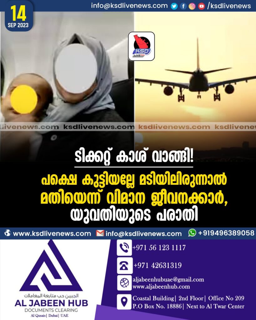 ടിക്കറ്റ് കാശ് വാങ്ങി! പക്ഷെ കുട്ടിയല്ലേ മടിയിലിരുന്നാൽ മതിയെന്ന് വിമാന ജീവനക്കാര്, യുവതിയുടെ പരാതി