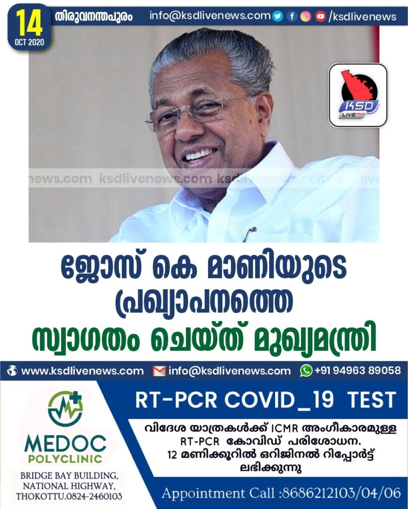 ജോസ് കെ മാണിയുടെ പ്രഖ്യാപനത്തെ സ്വാഗതം ചെയ്ത് മുഖ്യമന്ത്രി