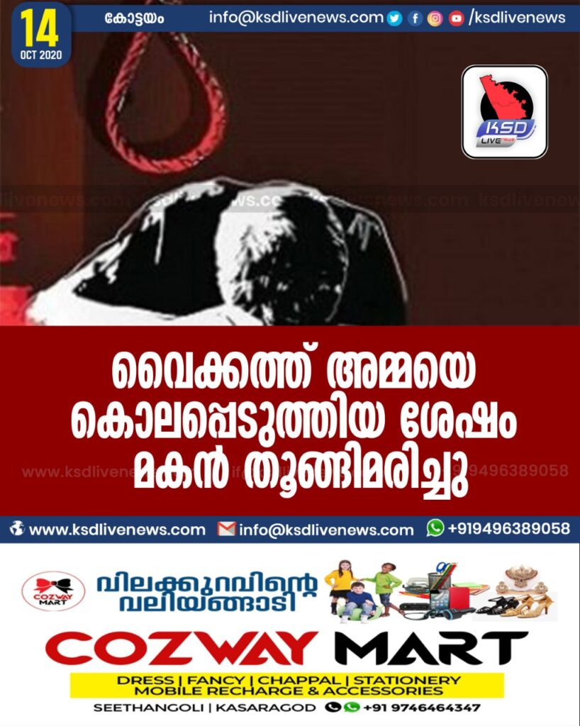 കോട്ടയം: വൈക്കത്ത് അമ്മയെ കൊലപ്പെടുത്തിയ ശേഷം മകൻ തൂങ്ങിമരിച്ചു. വൈക്കം ചെമ്പ് മത്തുങ്കല്ലിലാണ് സംഭവം. ആശാരി തറയിൽ കാർത്ത്യായനി, മകൻ ബിജു എന്നിവരെയാണ് മരിച്ച നിലയിൽ കണ്ടെത്തിയത്. പൊലീസ് സ്ഥലത്തെത്തി. സംഭവത്തിൽ അന്വേഷണം തുടങ്ങി.