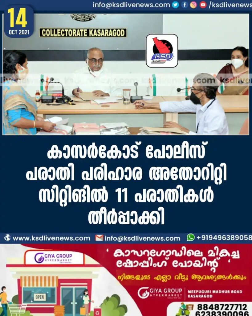 കാസര്കോട് പോലീസ് പരാതി പരിഹാര അതോറിറ്റി സിറ്റിങില് 11 പരാതികള് തീര്പ്പാക്കി