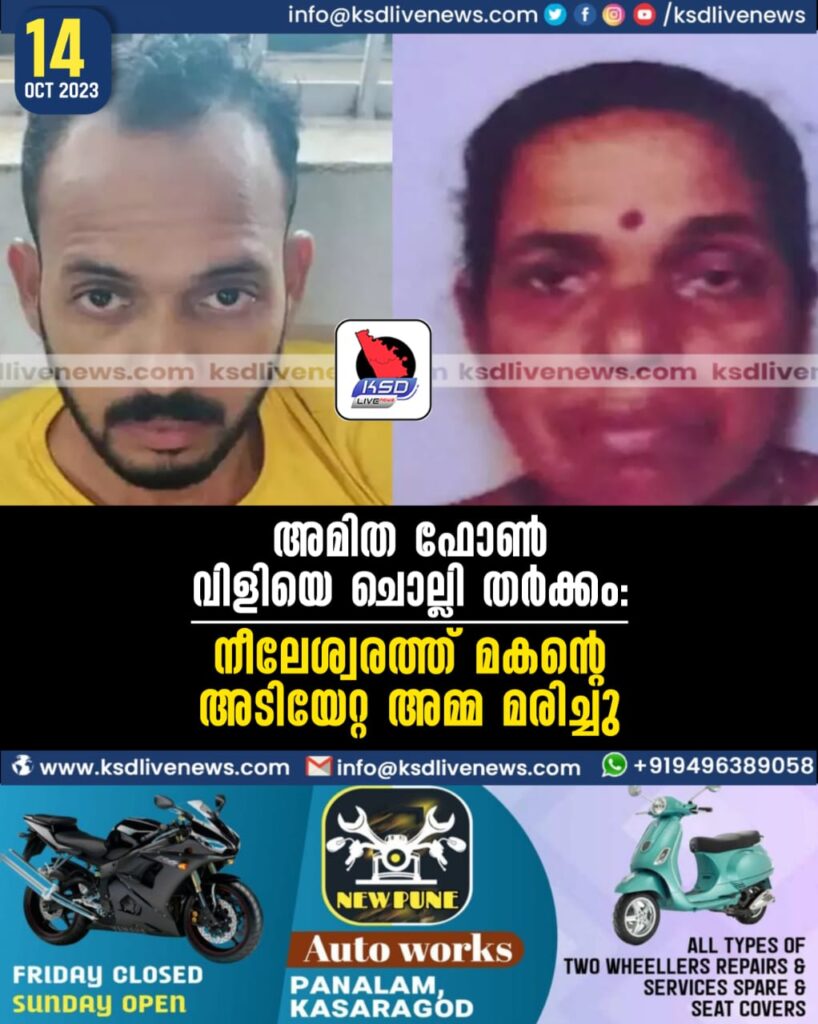 അമിത ഫോണ്‍ വിളിയെ ചൊല്ലി തർക്കം: നീലേശ്വരത്ത് മകന്റെ അടിയേറ്റ അമ്മ മരിച്ചു