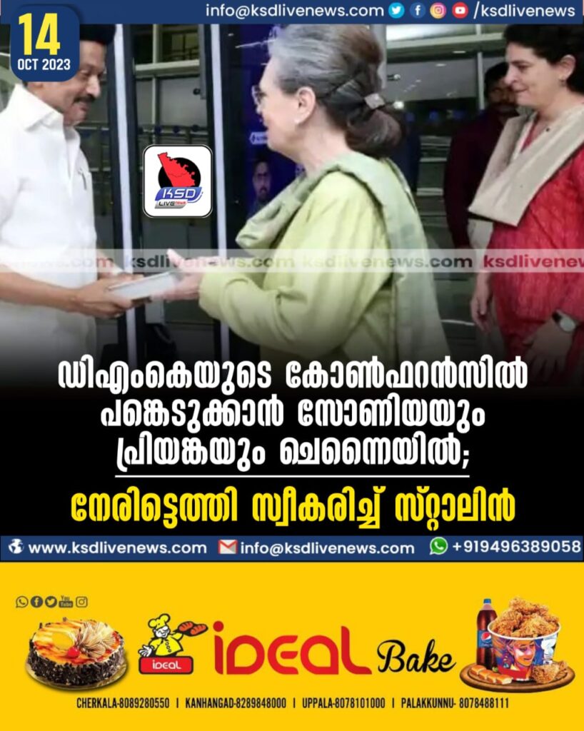 ഡിഎംകെയുടെ കോണ്‍ഫറൻസില്‍ പങ്കെടുക്കാൻ സോണിയയും പ്രിയങ്കയും ചെന്നൈയില്‍; നേരിട്ടെത്തി സ്വീകരിച്ച്‌ സ്റ്റാലിൻ
