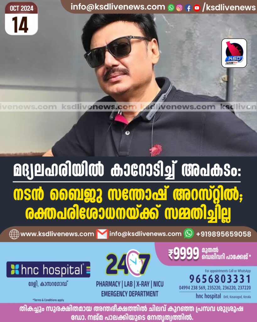 മദ്യലഹരിയിൽ കാറോടിച്ച് അപകടം: നടൻ ബൈജു സന്തോഷ് അറസ്റ്റിൽ; രക്തപരിശോധനയ്ക്ക് സമ്മതിച്ചില്ല