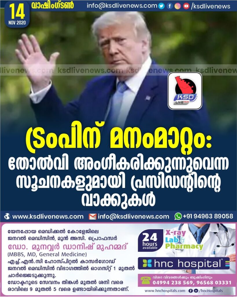 ട്രംപിന് മനംമാറ്റം : തോല്വി അംഗീകരിക്കുന്നുവെന്ന സൂചനകളുമായി പ്രസിഡന്റിന്റെ വാക്കുകള്