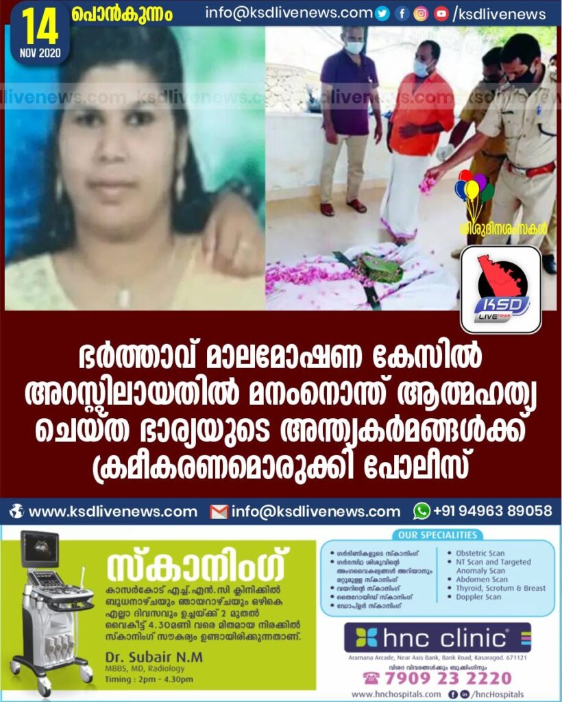 ഭർത്താവ് മാലമോഷണ കേസിൽ അറസ്റ്റിലായതിൽ മനംനൊന്ത് ആത്മഹത്യ ചെയ്ത ഭാര്യയുടെ അന്ത്യകർമങ്ങൾക്ക് ക്രമീകരണമൊരുക്കി പോലീസ്