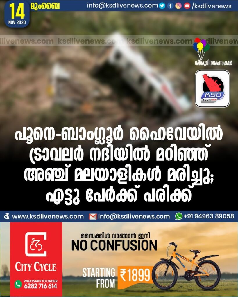 പൂനെ-ബാംഗ്ലൂര്‍ ഹൈവേയിലെ ഘോറയിലാണ്​ അപകടം. പാലത്തില്‍വെച്ച്‌​ ട്രക്കുമായി കൂട്ടിയിടിച്ച്‌​ നിയന്ത്രണം വിട്ട വാഹനം നദിയിലേക്ക് മറിയുകയായിരുന്നു. പാലത്തില്‍ നിന്ന് 50 അടി താഴ്ചയിലേക്കാണ്​ ട്രാവലര്‍ മറിഞ്ഞത്​. ​
