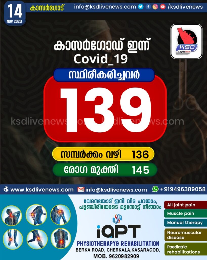 വാര്ത്താക്കുറിപ്പ് 14.11.2020 ജില്ലയില് 139 പേര്ക്ക് കോവിഡ്, 145 പേര്ക്ക് രോഗമുക്തികാസർഗോഡ് ജില്ലയില് 139 പേര്ക്ക് കൂടി കോവിഡ് 19 പോസിറ്റീവായി. സമ്പര്ക്കത്തിലൂടെ 136 പേര്ക്കും വിദേശത്ത് നിന്നെത്തിയ മൂന്ന് പേര്ക്കുമാണ് കോവിഡ് സ്ഥിരീകരിച്ചത്. 145 പേര്ക്ക് കോവിഡ് നെഗറ്റീവായെന്ന് ജില്ലാ മെഡിക്കല് ഓഫീസര് (ഹെല്ത്ത്) ഡോ.എ.വി. രാംദാസ് പറഞ്ഞു. നിലവില് 1364 പേരാണ് കോവിഡ് ചികിത്സയിലുള്ളത്.
