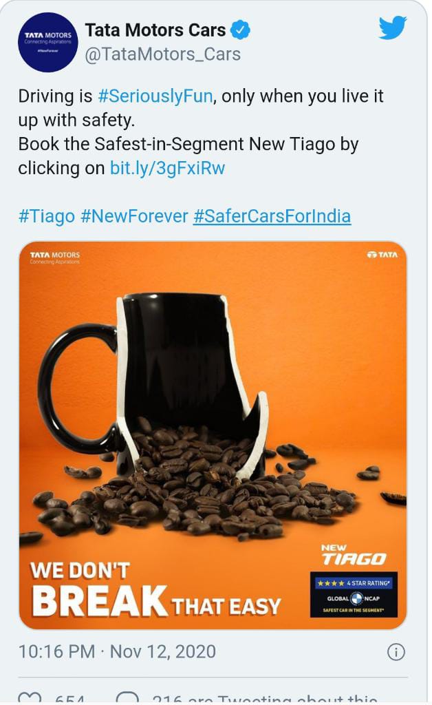 ഡ്രൈവിംഗ് മികച്ച അനുഭവമാണ്. എന്നാല് അത് സുരക്ഷ ഉണ്ടെങ്കില് മാത്രം. ഡ്രൈവിങ് സുരക്ഷിത പൂര്ണമാക്കാന് പുതിയ ടിയാഗോ ഇന്ന് തന്നെ ബുക്ക് ചെയ്യൂ.. എന്നാണ് ടാറ്റ ട്വീറ്റ് ചെയ്തത്. ഒപ്പം പൊട്ടിയ ഒരു കോഫി കപ്പിന്റെ ചിത്രവും കമ്ബനി പങ്കുവെച്ചിട്ടുണ്ട്.