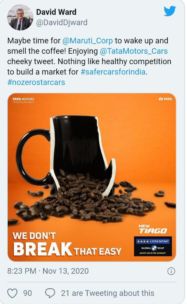 എന്ട്രി ലെവല് ഹാച്ച് ബാക്ക് ആയ ടാറ്റ ടിയാഗോയ്ക്ക് ക്രാഷ് ടെസ്റ്റില് നാല് സ്റ്റാര് റേറ്റിങ് ആണ് ഉള്ളത്. ടാറ്റയുടെ ട്വീറ്റ് ഗ്ലോബല് എന്സിഎപി പ്രസിഡന്റും സിഇഒയുമായ ഡേവിഡ് വാര്ഡ് ശ്രദ്ധിക്കുകയും മറ്റൊരു ട്വീറ്റ് പങ്കുവെയ്ക്കുകയും ചെയ്തു. മാരുതി ഉറക്കത്തില് നിന്നും ഉയരുകയും കോഫി മണക്കുകയും ചെയ്യേണ്ട സമയം ആണെന്നും ടാറ്റയുടെ ട്വീറ്റ് ആസ്വദിക്കുന്നുവെന്നും അദ്ദേഹം കുറിച്ചു. ഒരു വിപണി കെട്ടിപ്പെടുക്കുന്നതിന് ആരോഗ്യകരമായ മത്സരം പോലെ മറ്റൊന്നുമില്ലെന്നും അദ്ദേഹം ട്വീറ്റ് ചെയ്തു.