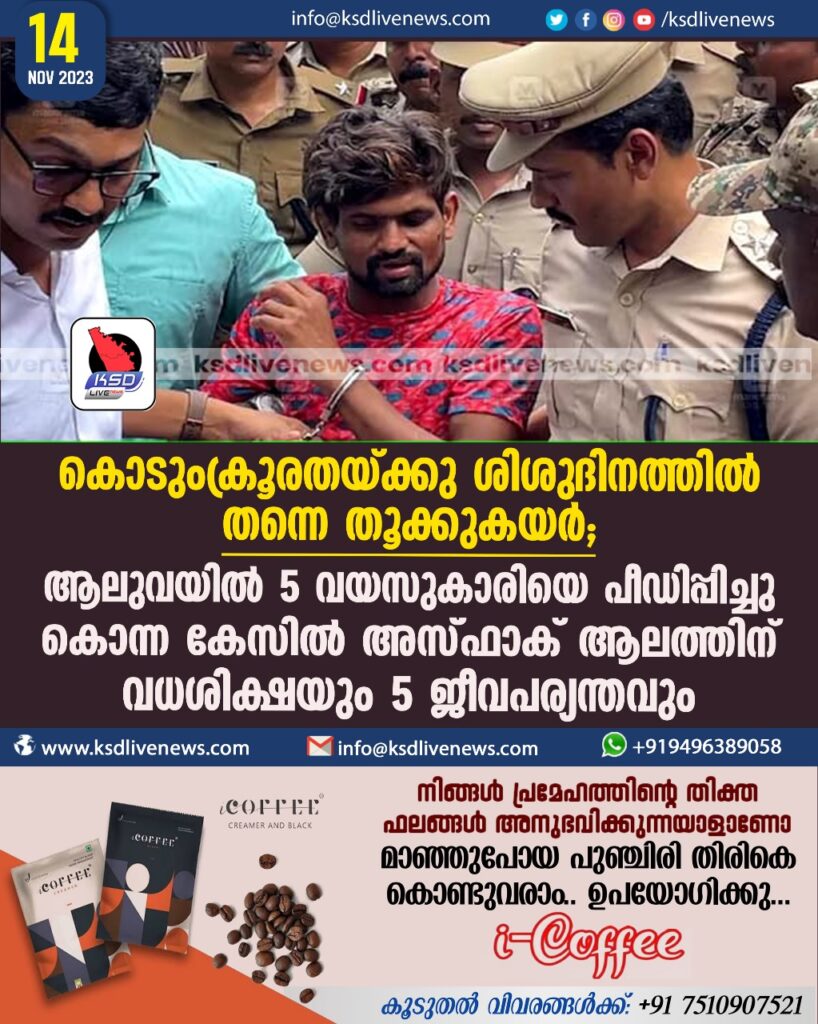 കൊടുംക്രൂരതയ്ക്കു ശിശു ദിനത്തിൽ തന്നെ തൂക്കുകയര്; ആലുവയില് 5 വയസുകാരിയെ പീഡിപ്പിച്ചു കൊന്ന കേസില് അസ്ഫാക്ക് ആലത്തിന് വധശിക്ഷയും 5 ജീവപര്യന്തവും