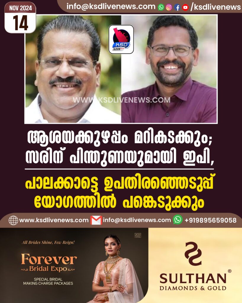 ആശയക്കുഴപ്പം മറികടക്കും; സരിന് പിന്തുണയുമായി ഇപി, പാലക്കാട്ടെ ഉപതിരഞ്ഞെടുപ്പ് യോഗത്തില് പങ്കെടുക്കും