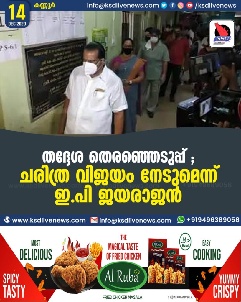 കണ്ണൂർ: തദ്ദേശ തിരഞ്ഞെടുപ്പിൽ എൽഡിഎഫ് ചരിത്രവിജയം നേടുമെന്ന് മന്ത്രി ഇ.പി ജയരാജൻ പറഞ്ഞു. കണ്ണൂരിലെ ബൂത്തിൽ രാവിലെ ഏഴ് മണിക്ക് തന്നെ വോട്ട് രേഖപ്പെടുത്തിയ ശേഷം മാധ്യമങ്ങളോട് സംസാരിക്കുകയായിരുന്നു അദ്ദേഹം.