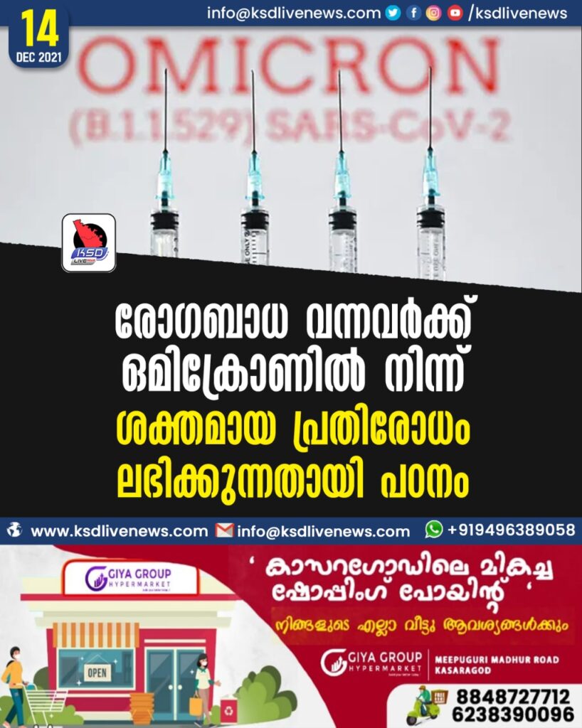 രോഗബാധ വന്നവർക്ക് ഒമിക്രോണിൽ നിന്ന് ശക്തമായ പ്രതിരോധം ലഭിക്കുന്നതായി പഠനം