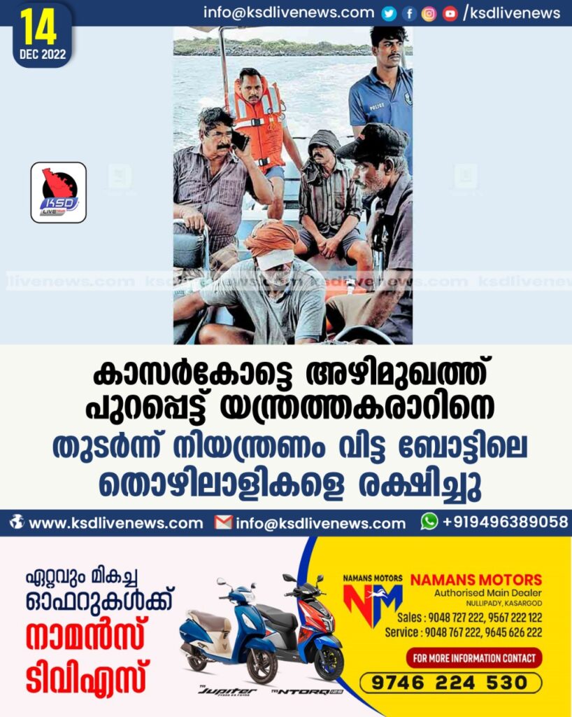 കാസർകോട്ടെ അഴിമുഖത്ത് പുറപ്പെട്ട് യന്ത്രത്തകരാറിനെ തുടർന്ന് നിയന്ത്രണംവിട്ട ബോട്ടിലെ തൊഴിലാളികളെ രക്ഷിച്ചു