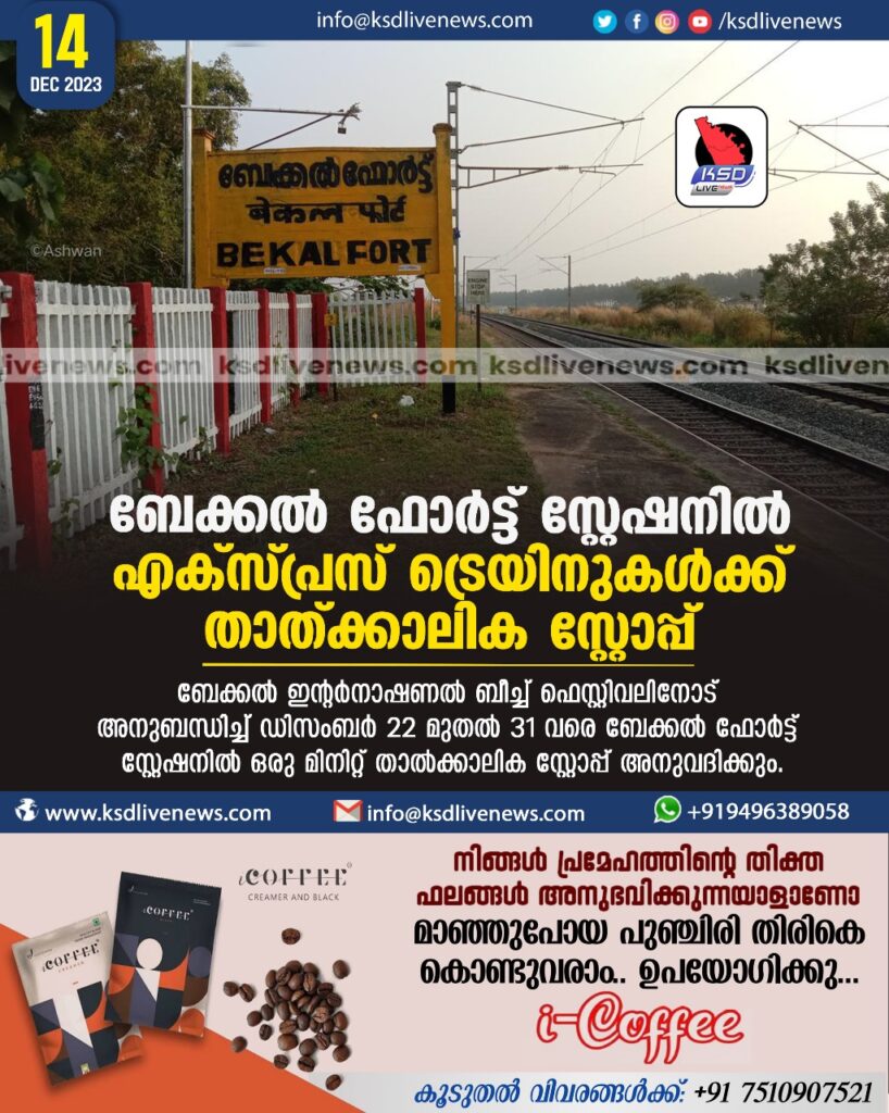കാസർകോട്∙ ബേക്കൽ ഫോർട്ട് സ്റ്റേഷനിൽ എക്സ്പ്രസ് ട്രെയിനുകൾക്ക് താത്കാലിക സ്റ്റോപ്പ് അനുവദിച്ചു. ബേക്കൽ ഇന്റർനാഷണൽ ബീച്ച് ഫെസ്റ്റിവലിനോട് അനുബന്ധിച്ച് ഡിസംബർ 22 മുതൽ 31 വരെ ബേക്കൽ ഫോർട്ട് സ്റ്റേഷനിൽ ഒരു മിനിറ്റ് താൽക്കാലിക സ്റ്റോപ്പ് അനുവദിക്കും. ചെന്നൈ എഗ്മോർ – മംഗളൂരു സെൻട്രൽ എക്സ്പ്രസ്, നാഗർകോവിൽ – മംഗളൂരു സെൻട്രൽ എക്സ്പ്രസ്, ഡോ. എംജിആർ ചെന്നൈ സെൻട്രൽ – മംഗളൂരു സെൻട്രൽ എക്സ്പ്രസ് എന്നീ ട്രെയിനുകൾക്കാണ് സ്റ്റോപ് അനുവദിച്ചിരിക്കുന്നത്.