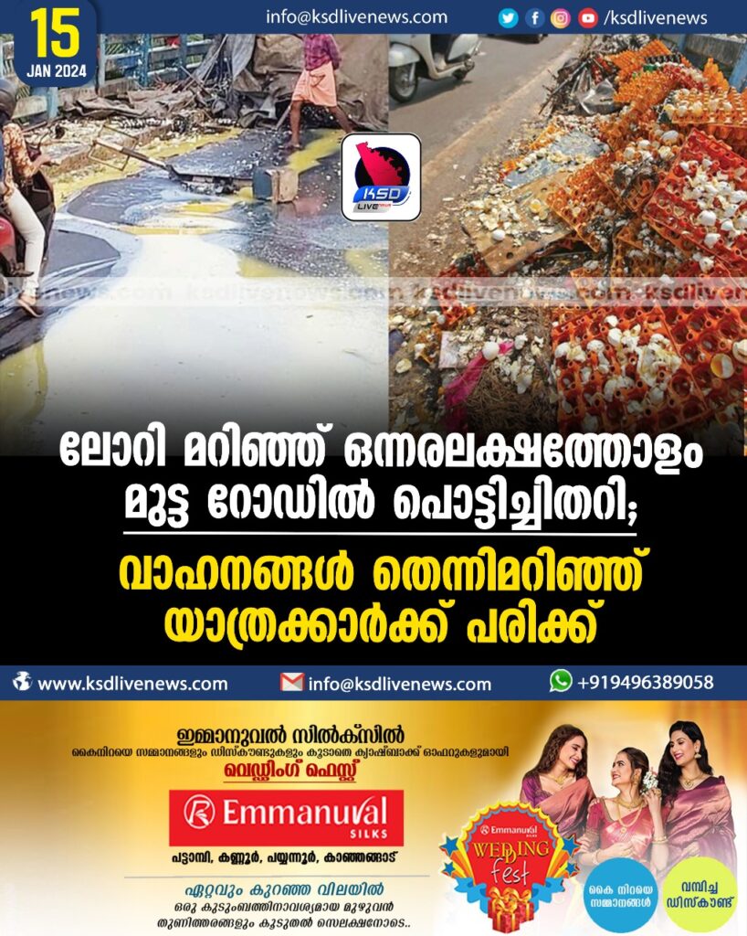 ലോറി മറിഞ്ഞ് ഒന്നരലക്ഷത്തോളം മുട്ട റോഡിൽ പൊട്ടിച്ചിതറി;വാഹനങ്ങൾ തെന്നിമറിഞ്ഞ് യാത്രക്കാർക്ക് പരിക്ക്