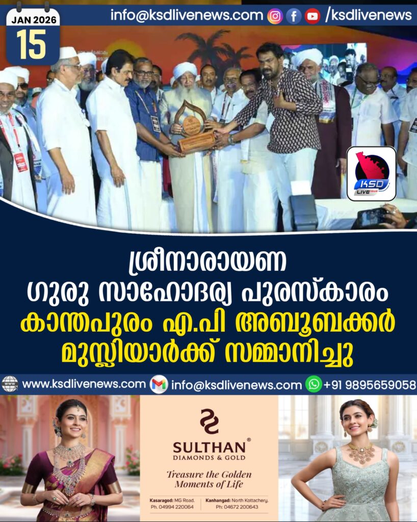 ശ്രീനാരായണ ഗുരു സാഹോദര്യ പുരസ്‌കാരം കാന്തപുരം എ പി അബൂബക്കർ മുസ്ലിയാർക്ക് സമ്മാനിച്ചു