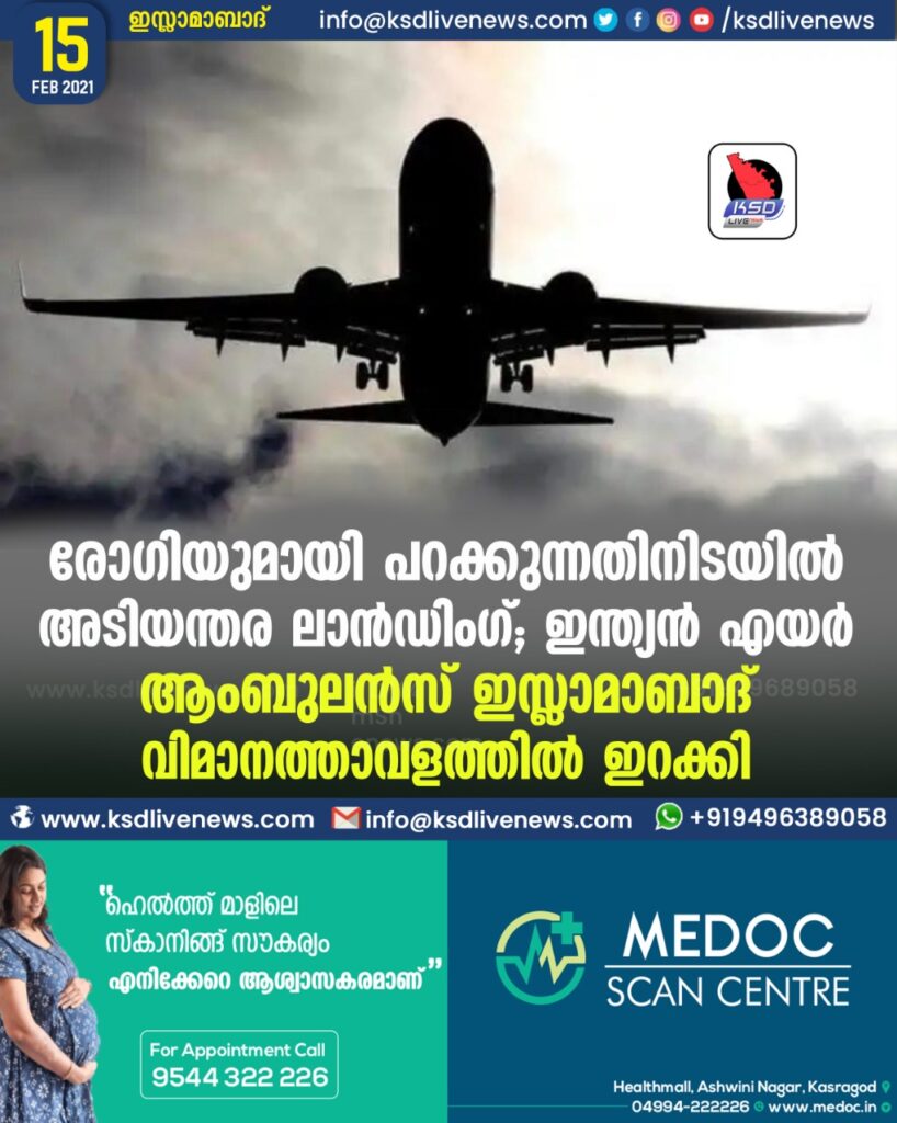 രോഗിയുമായി പറക്കുന്നതിനിടയിൽ അടിയന്തര ലാൻഡിംഗ് ; ഇന്ത്യൻ എയർ ആംബുലൻസ് ഇസ്ലാമാബാദ് വിമാനത്താവളത്തിൽ ഇറക്കി