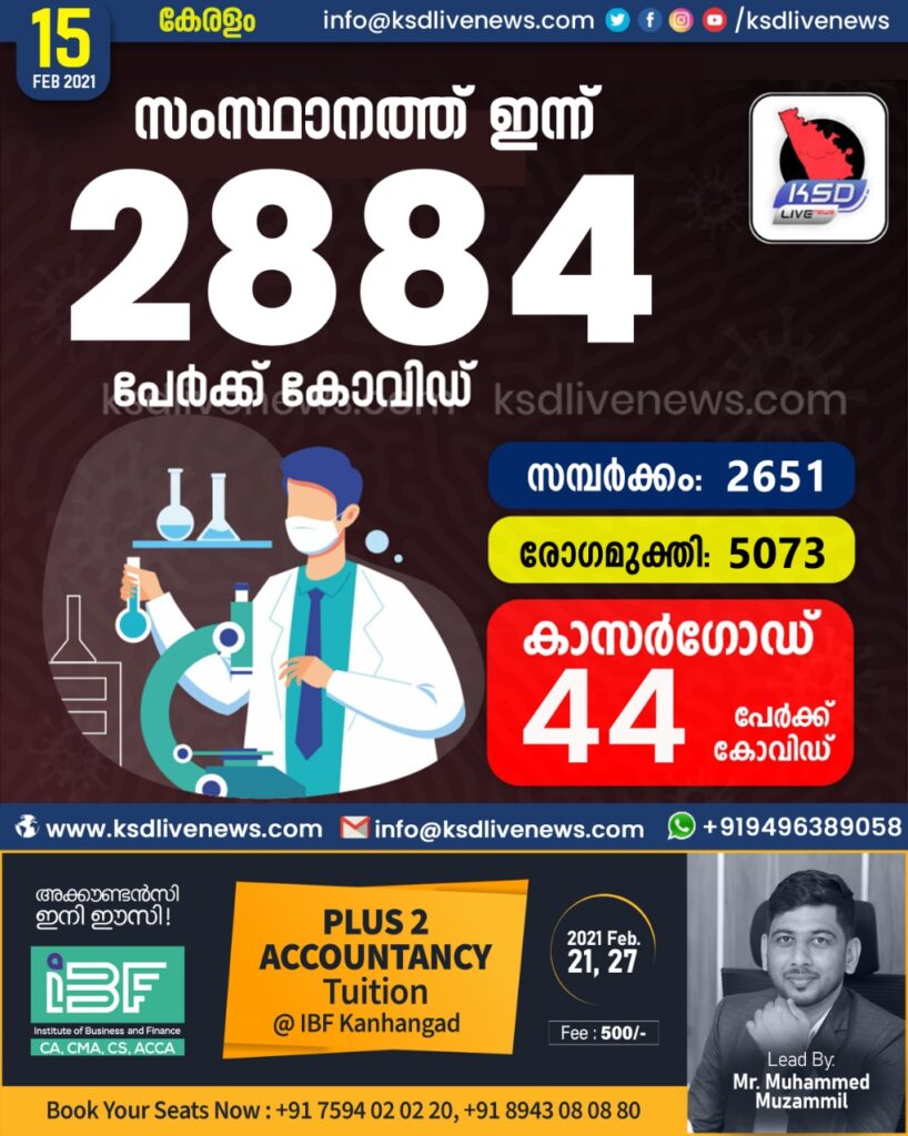 സംസ്ഥാനത്ത് ഇന്ന് 2884 പേർക്ക് കോവിഡ് സ്ഥിരീകരിച്ചു. സമ്പർക്കം വഴി 2651 പേർക്കും ; ആശ്വാസമായി 5073 പേർക്ക് രോഗ മുക്തിയും ; കാസർഗോഡ് ജില്ലയിൽ 44 പേർക്ക് പുതിയ കോവിഡ് കേസുകൾ ; മരണം 13
