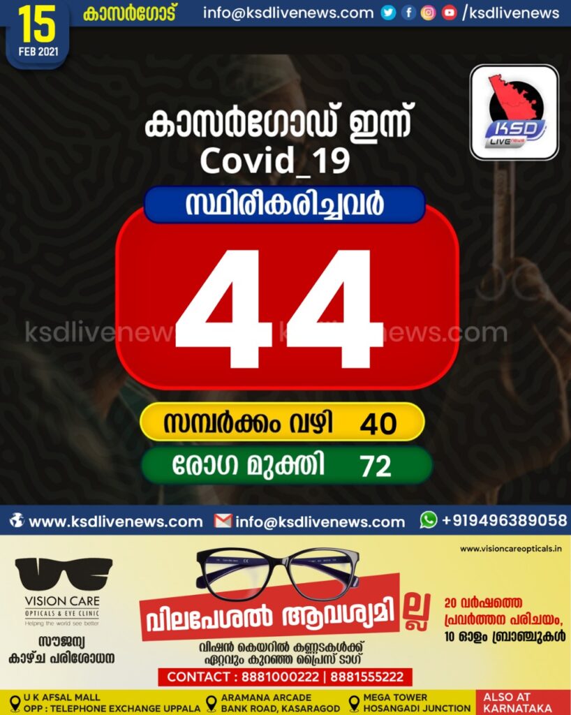 കാസർഗോഡ് ജില്ലയിൽ ഇന്ന് 44 പേർക്ക് കോവിഡ് സ്ഥിരീകരിച്ചു. സമ്പർക്കം വഴി 40 പേർക്കും. 72 പേർക്ക് രോഗമുക്തി