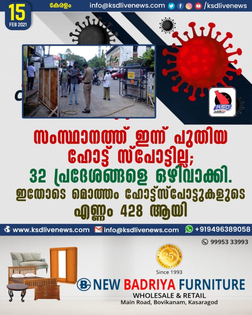സംസ്ഥാനത്ത് ഇന്ന് ഇന്ന് പുതിയ ഹോട്ട് സ്പോട്ടില്ല. 32 പ്രദേശങ്ങളെ ഒഴിവാക്കി. ഇതോടെ മൊത്തം ഹോട്ട്സ്പോട്ടുകളുടെ എണ്ണം 428 ആയി.SHARE THIS ONസംസ്ഥാനത്ത് ഇന്ന് ഇന്ന് പുതിയ ഹോട്ട് സ്പോട്ടില്ല.സംസ്ഥാനത്ത് ഇന്ന് ഇന്ന് പുതിയ ഹോട്ട് സ്പോട്ടില്ല. 32 പ്രദേശങ്ങളെ ഒഴിവാക്കി. ഇതോടെ മൊത്തം ഹോട്ട്സ്പോട്ടുകളുടെ എണ്ണം 428 ആയി.