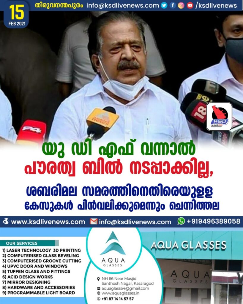 യു ഡി എഫ് വന്നാൽ പൗരത്വ ബി ൽ നടപ്പാക്കില്ല , ശബരിമല സമരത്തിനെതിരെയുളള കേസുകൾ പിൻവലിക്കുമെന്നും ചെന്നിത്തല
