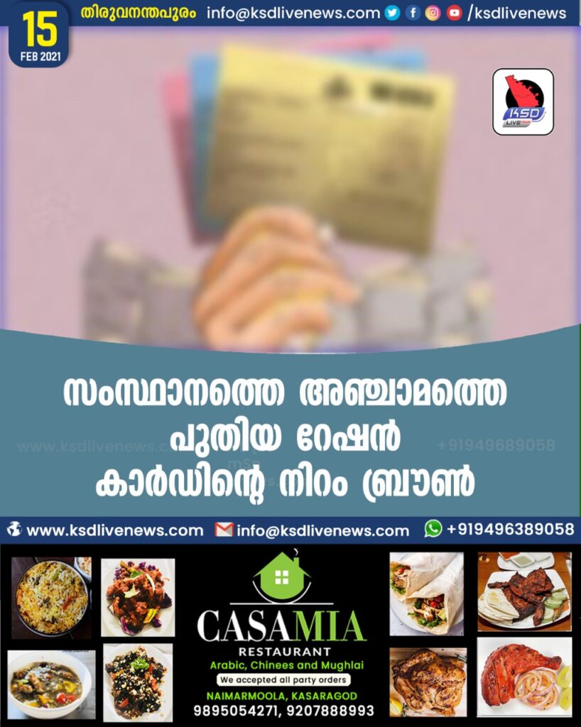 സംസ്ഥാനത്തെ അഞ്ചാമത്തെ പുതിയ റേഷൻ കാർഡിന്റെ നിറം ബ്രൗൺ