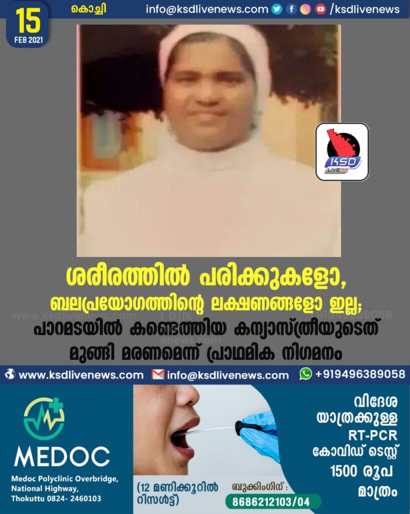 ശരീരത്തിൽ പരിക്കുകളോ , ബലപ്രയോഗത്തിന്റെ ലക്ഷണങ്ങളോ ഇല്ല ; പാറമടയിൽ കണ്ടെത്തിയ കന്യാസ്ത്രീയുടെത് മുങ്ങി മരണമെന്ന് പ്രാഥമിക നിഗമനം