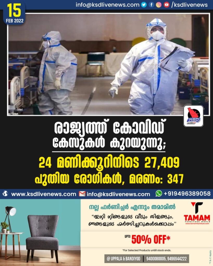 രാജ്യത്ത് കോവിഡ് കേസുകള്‍ കുറയുന്നു; 24 മണിക്കൂറിനിടെ 27,409 പുതിയ രോഗികള്‍, മരണം: 347