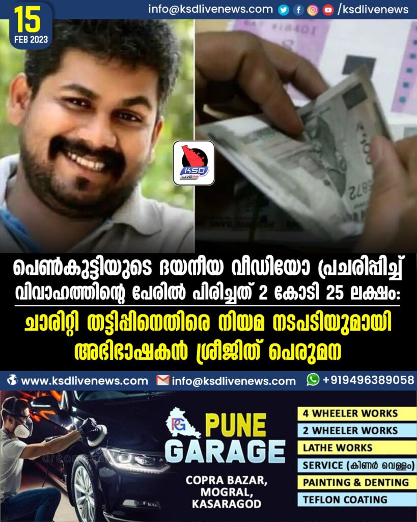 പെണ്കുട്ടിയുടെ ദയനീയ വീഡിയോ പ്രചരിപ്പിച്ച് വിവാഹത്തിന്റെ പേരില് പിരിച്ചത് 2 കോടി 25 ലക്ഷം: ചാരിറ്റി തട്ടിപ്പിനെതിരെ നിയമ നടപടിയുമായി അഭിഭാഷകന് ശ്രീജിത് പെരുമന.