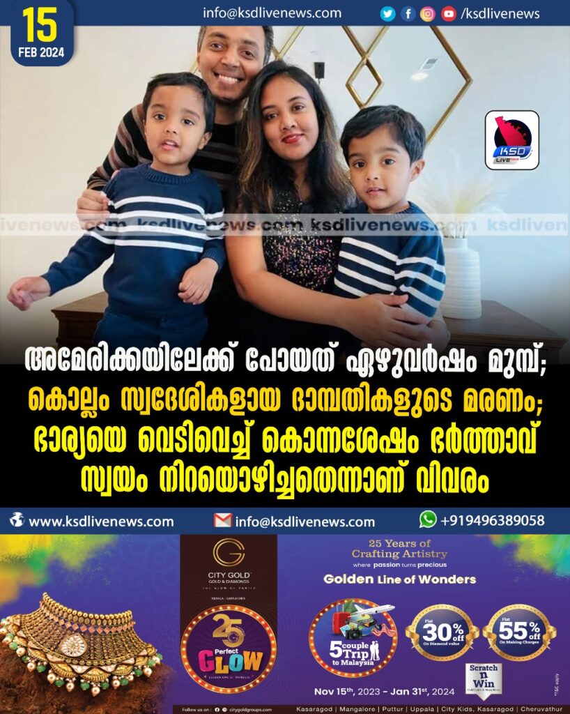 അമേരിക്കയിലേക്ക് പോയത് ഏഴുവര്ഷം മുമ്പ്; കൊല്ലം സ്വദേശികളായ ദാമ്പതികളുടെ മരണം; ഭാര്യയെ വെടിവെച്ച് കൊന്നശേഷം ഭര്ത്താവ് സ്വയം നിറയൊഴിച്ചതെന്നാണ് വിവരം