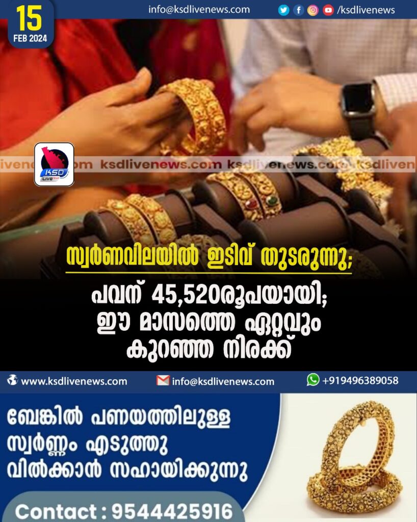 സ്വര്ണവിലയില് ഇടിവ് തുടരുന്നു; പവന് 45,520രൂപയായി; ഈ മാസത്തെ ഏറ്റവും കുറഞ്ഞ നിരക്ക്