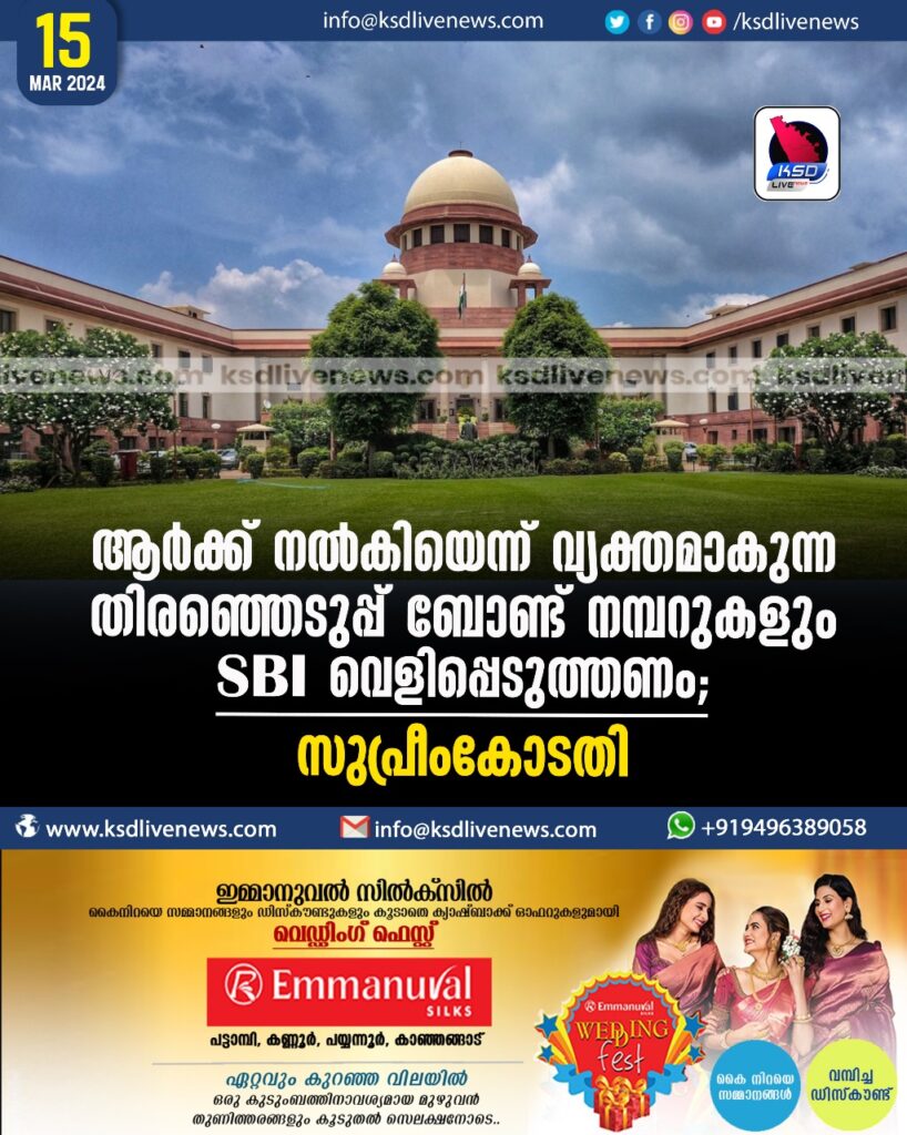 തിരഞ്ഞെടുപ്പ് ബോണ്ടുമായി ബന്ധപ്പെട്ട എല്ലാ രേഖകളും തെരെഞ്ഞെടുപ്പ് കമ്മീഷന് കൈമാറാനായിരുന്നു തങ്ങളുടെ ഉത്തരവെന്ന് ബെഞ്ച് ചൂണ്ടിക്കാട്ടി. എന്നാല് തിരഞ്ഞെടുപ്പ് ബോണ്ട് നമ്പര് എസ്ബിഐ കമ്മീഷന് കൈമാറിയിട്ടില്ലെന്ന് ഹര്ജിക്കാര്ക്ക് വേണ്ടി ഹാജരായ സീനിയര് അഭിഭാഷകന് കപില് സിബലും, അഭിഭാഷകന് പ്രശാന്ത് ഭൂഷണും ചൂണ്ടിക്കാട്ടി.