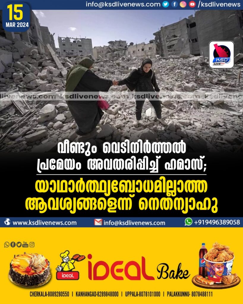 വീണ്ടും വെടിനിര്‍ത്തല്‍ പ്രമേയം അവതരിപ്പിച്ച് ഹമാസ്; യാഥാര്‍ത്ഥ്യബോധമില്ലാത്ത ആവശ്യങ്ങളെന്ന് നെതന്യാഹു