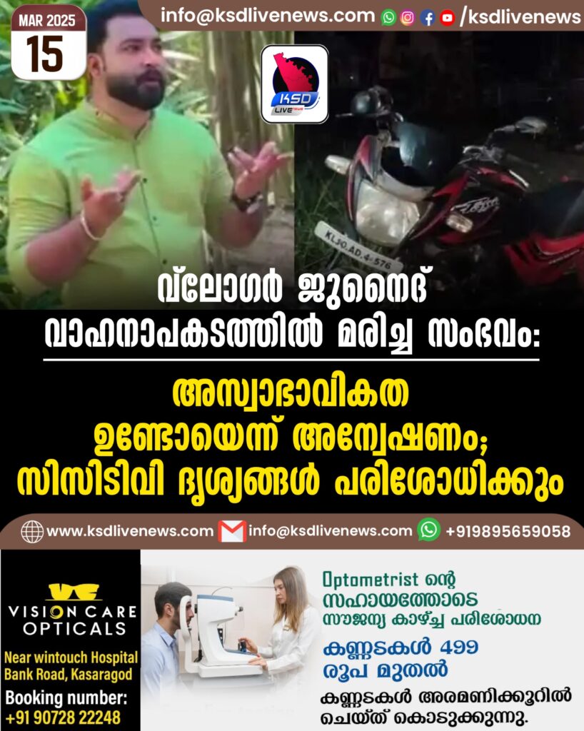 വ്ലോഗര് ജുനൈദ് വാഹനാപകടത്തില് മരിച്ച സംഭവം: അസ്വാഭാവികത ഉണ്ടോയെന്ന് അന്വേഷണം; സിസിടിവി ദൃശ്യങ്ങള് പരിശോധിക്കും
