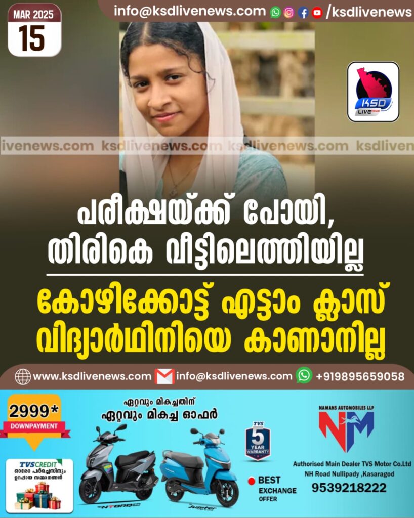 പരീക്ഷയ്ക്ക് പോയി, തിരികെ വീട്ടിലെത്തിയില്ല; കോഴിക്കോട്ട് എട്ടാം ക്ലാസ് വിദ്യാർഥിനിയെ കാണാനില്ല
