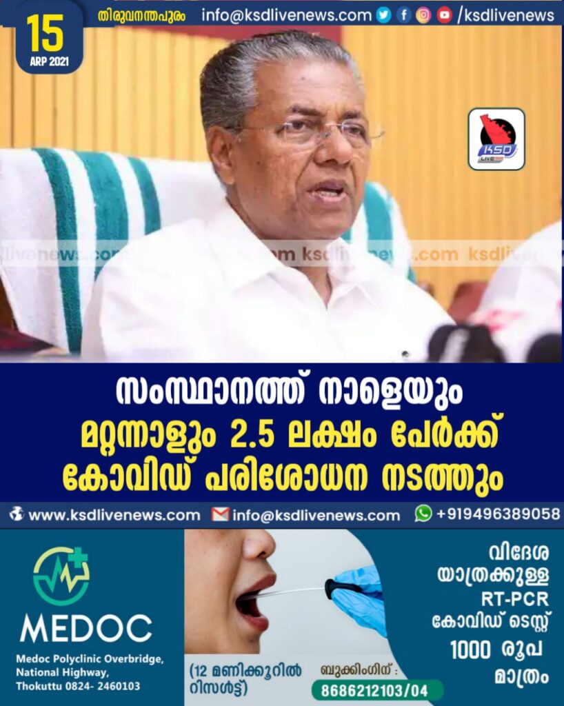 സംസ്ഥാനത്ത് നാളെയും മറ്റന്നാളും 2.5 ലക്ഷം പേർക്ക് കോവിഡ് പരിശോധന നടത്തും