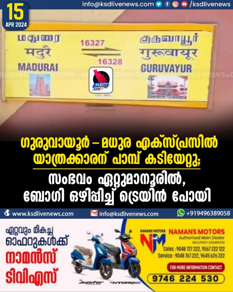 ഗുരുവായൂര്-മധുര എക്സ്പ്രസില് യാത്രക്കാരന് പാമ്പ് കടിയേറ്റു; സംഭവം ഏറ്റുമാനൂരില്, ബോഗി ഒഴിപ്പിച്ച് ട്രെയിൻ പോയി