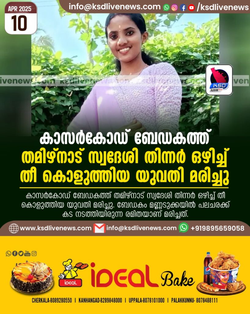 കാസര്കോഡ് ബേഡകത്ത് തമിഴ്നാട് സ്വദേശി തിന്നര് ഒഴിച്ച് തീ കൊളുത്തിയ യുവതി മരിച്ചു