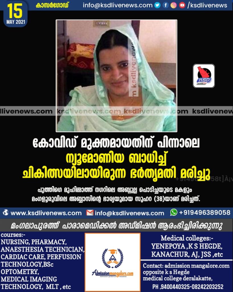 പുത്തിഗെ മുഹിമ്മാത്ത് നഗറിലെ അബ്ദുല്ല പൊടിച്ചയുടെ മകളും മംഗളൂരുവിലെ അബ്ബാസിന്റെ ഭാര്യയുമായ സുഹറ (38)യാണ് മരിച്ചത്. ഏതാനും ദിവസം മുമ്പ് കോവിഡ് ബാധിച്ച് മംഗളൂരുവിലെ ആസ്പത്രിയില്‍ പ്രവേശിപ്പിച്ചിരുന്നു. കോവിഡ് മുക്തമായെങ്കിലും പിന്നീട് ന്യൂമോണിയ ബാധിച്ചതിനെ തുടര്‍ന്ന് ചികിത്സയിലായിരുന്നു. ഇന്നലെ വൈകിട്ടാണ് മരിച്ചത്. നേരത്തെ ഭര്‍ത്താവിനും കോവിഡ് സ്ഥിരീകരിച്ചിരുന്നു.