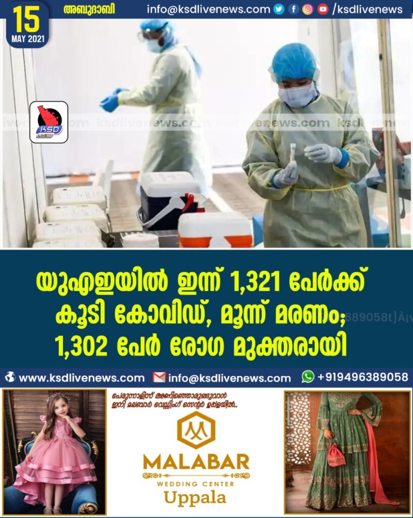 യുഎഇയില് ഇന്ന് 1,321 പേര്ക്ക് കൂടി കോവിഡ്, മൂന്ന് മരണം; 1,302 പേർ രോഗ മുക്തരായി