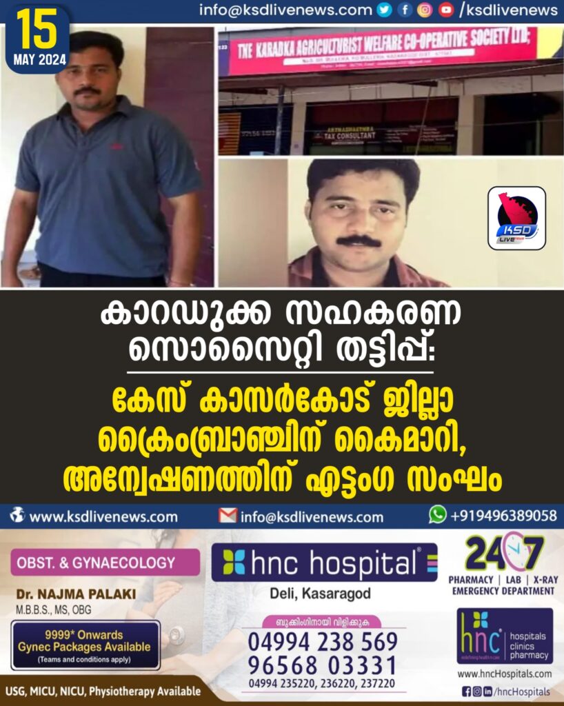 കാറഡുക്ക സഹകരണ സൊസൈറ്റി തട്ടിപ്പ്: കേസ് കാസര്കോട് ജില്ലാ ക്രൈംബ്രാഞ്ചിന് കൈമാറി, അന്വേഷണത്തിന് എട്ടംഗ സംഘം