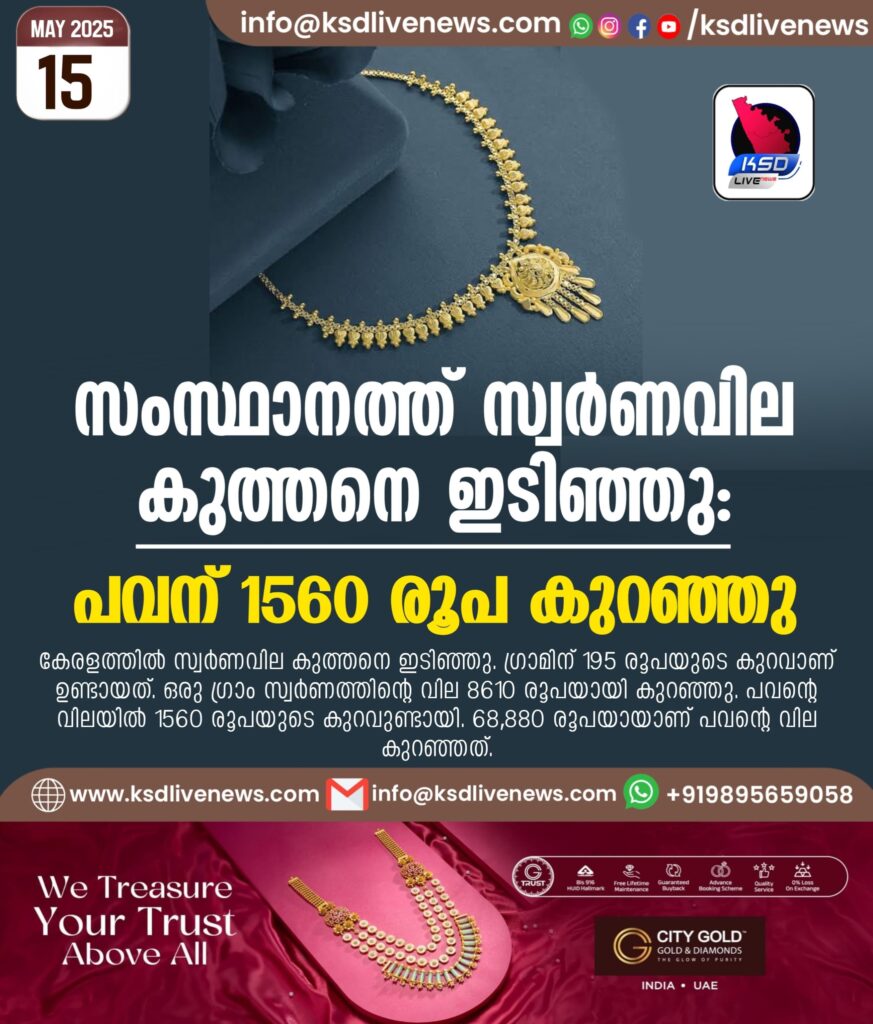 സംസ്ഥാനത്ത് സ്വര്ണവില കുത്തനെ ഇടിഞ്ഞു: പവന് 1560 രൂപ കുറഞ്ഞു