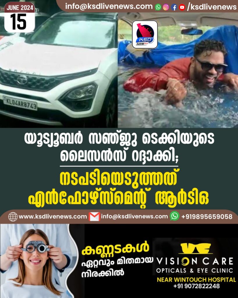 യൂട്യൂബര് സഞ്ജു ടെക്കിയുടെ ലൈസന്സ് റദ്ദാക്കി; നടപടിയെടുത്തത് എന്ഫോഴ്സ്മെന്റ് ആര്ടിഒ